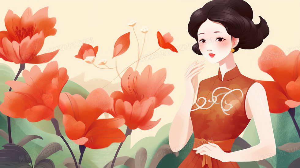 本作品內(nèi)容為紅色花朵中穿旗袍的優(yōu)雅女子古風插畫, 格式為 jpg, 大小4 MB, 圖片尺寸為2912 x 1632, 源文件無水印, 歡迎使用熊貓辦公。 如認為平臺內(nèi)容涉嫌侵權(quán),可通過郵件:tousu@tukuppt.com提出書面通知,我們將及時處理。