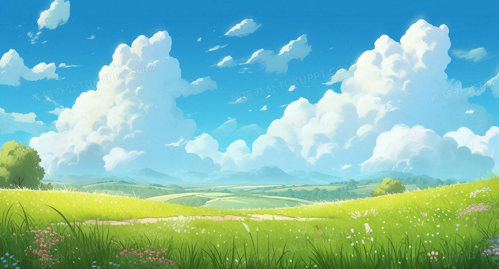 本作品內容為卡通唯美藍天白云和青草地, 格式為 jpg, 大小1 MB, 圖片尺寸為1856 x 1000, 源文件無水印, 歡迎使用熊貓辦公。 如認為平臺內容涉嫌侵權,可通過郵件:tousu@tukuppt.com提出書面通知,我們將及時處理。